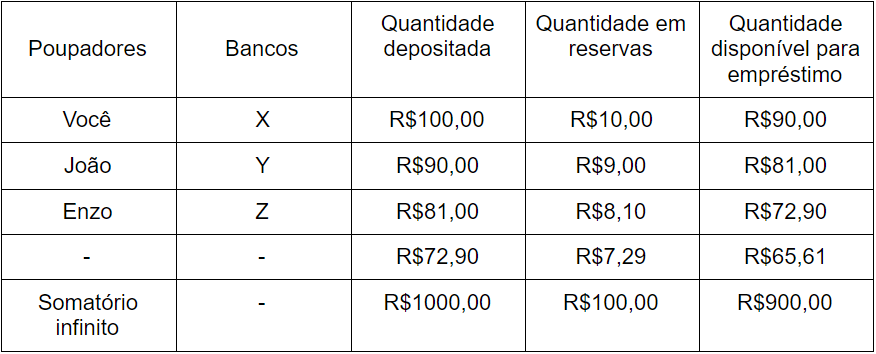 Nesse caso, o multiplicador seria 10, pois R$100 iniciais se transformam em R$1.000 (com R$100 mantidos em reservas e R$900 disponibilizados como crédito).